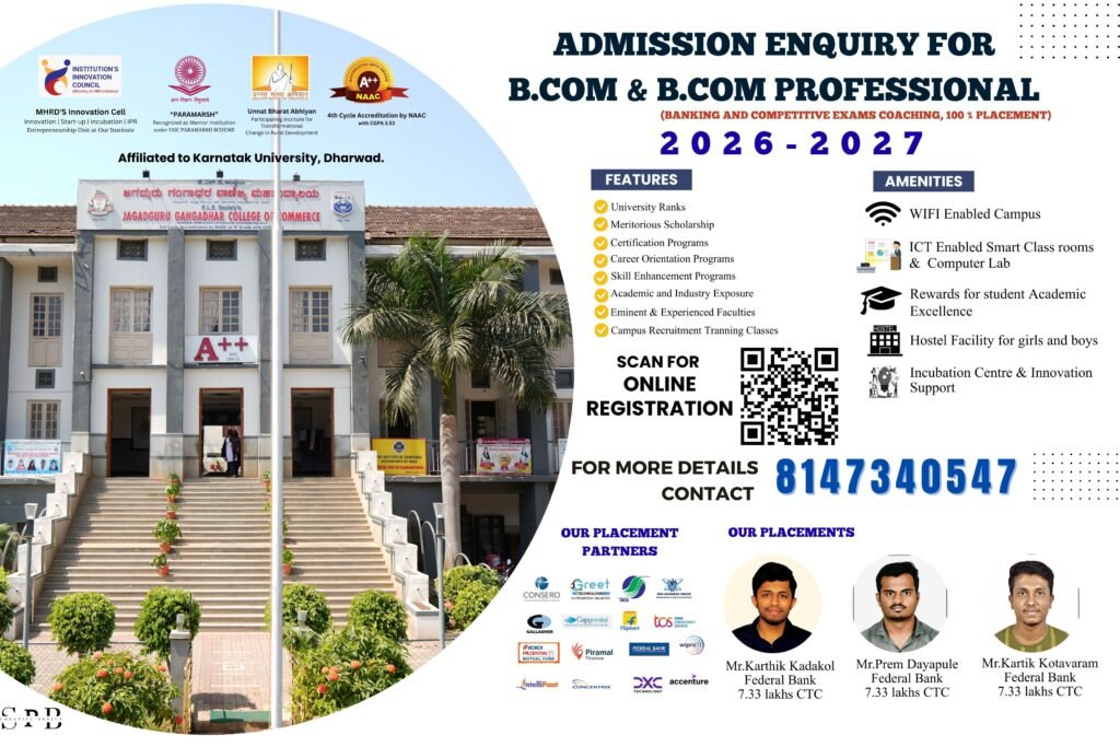 The student who have passed the II year P.U. Course conducted by the P.U.E. Board, Bangalore or any equivalent examination of other Board as recognized by the Karnatak University, Dharwad and also passed in the Job oriented course and Diploma Course of Karnataka Govt. are eligible to seek admission to B.Com Part-I.